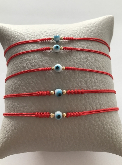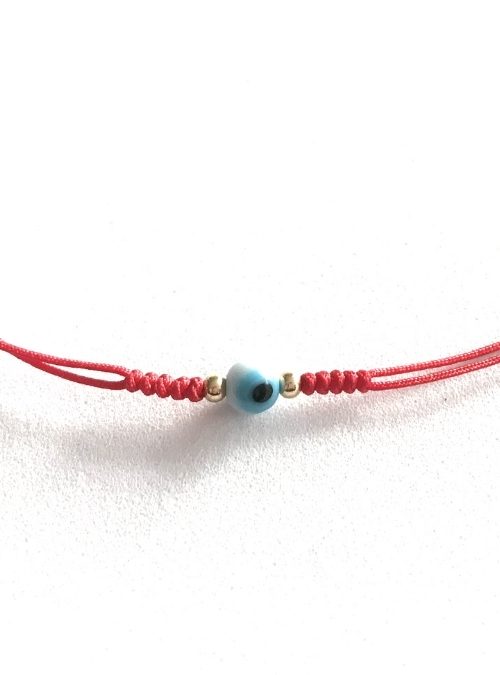 Pulsera ajustable de hilo rojo tejida con ojito de protección.