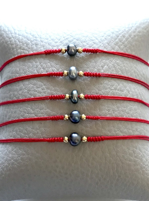 Pulsera ajustable de hilo rojo tejida con perla negra.